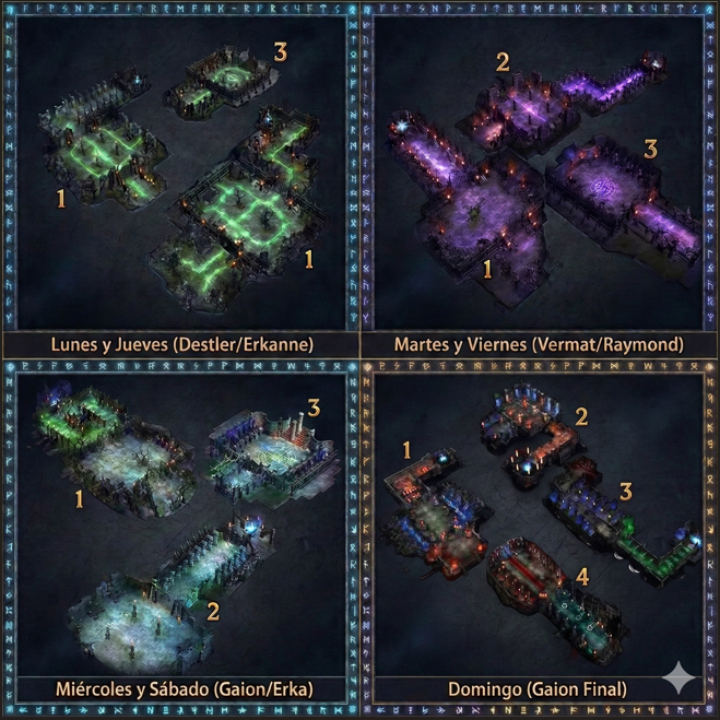 Para ingresar el Domingo, necesitas el Complete Secromicon, que se crea combinando los 6 fragmentos obtenidos durante la semana junto con un Jewel of Chaos en la Chaos Machine.